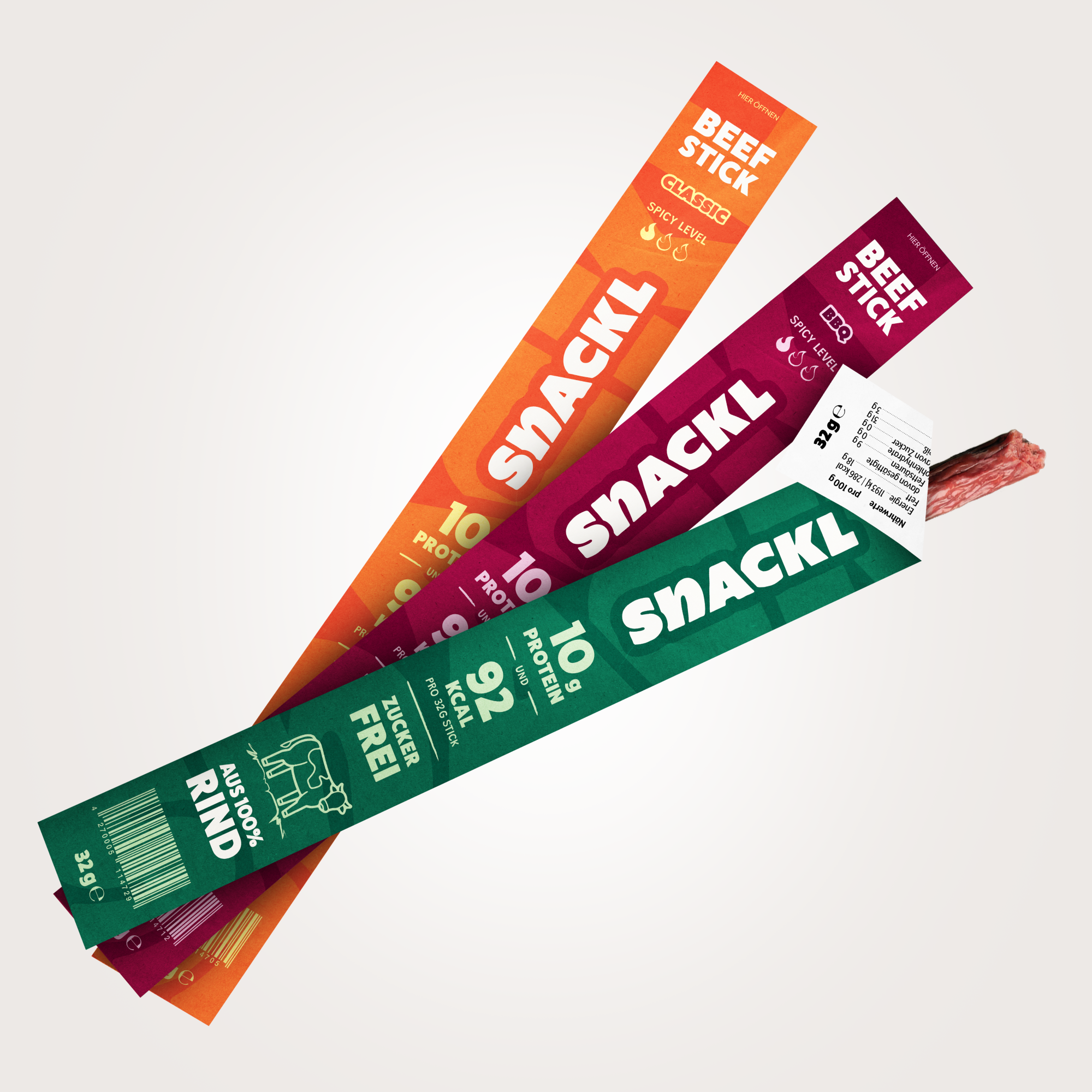 SNACKL Beef-Sticks sind die herzhafte Alternative zu herkömmlichen Protein-Snacks. Natürliche Protein Power mit 100% Rindfleisch und natürlichen Zutaten.