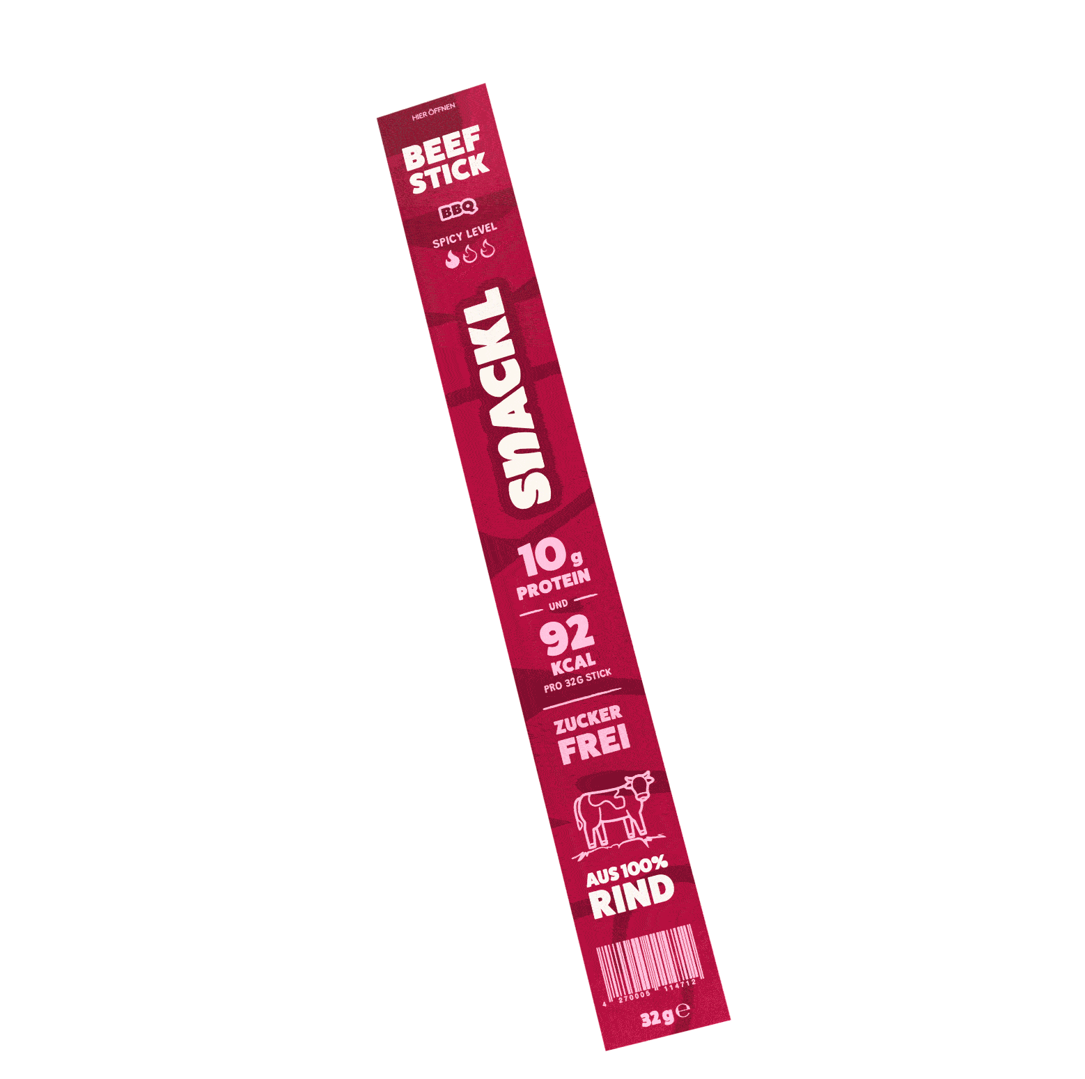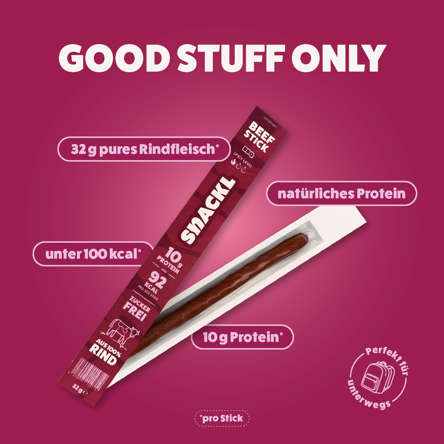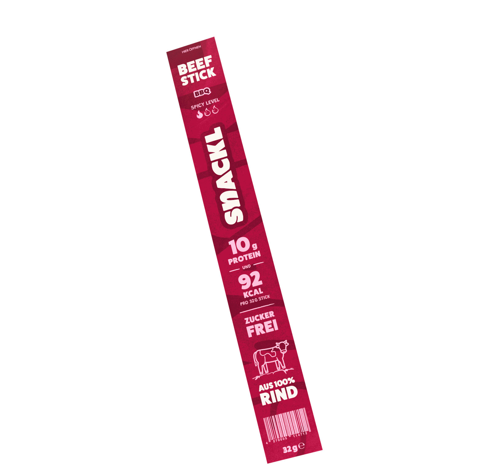 SNACKL Beef-Sticks sind die herzhafte Alternative zu herkömmlichen Protein-Snacks. Natürliche Protein Power mit 100% Rindfleisch und natürlichen Zutaten.